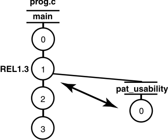 In the figure above, main, pat_usability, and db_optimize are branches being used to develop concurrently different releases of the file element prog.c.