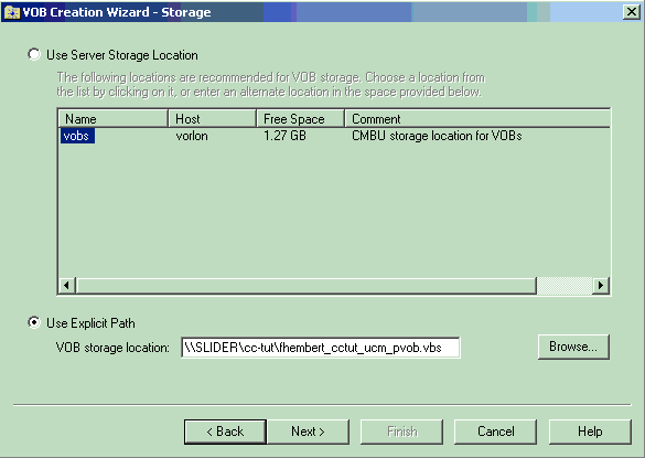 - Click OK. The VOB storage location on the Storage page of the wizard should be similar to \\your-computer-name\cc-tut\your-username_cctut_ucm_pvob.vbs.