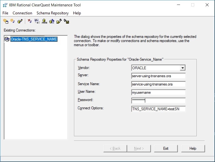 With this example, the connection string in Maintenance Tool would use TNS_SERVICE_NAME=oracletestSN . When using the TNS_SERVICE_NAME in the connection string, any values defined in the tnsnames.ora such as HOST, PORT, SERVICE_NAME will override any values supplied in the Maintenance Tool fields.