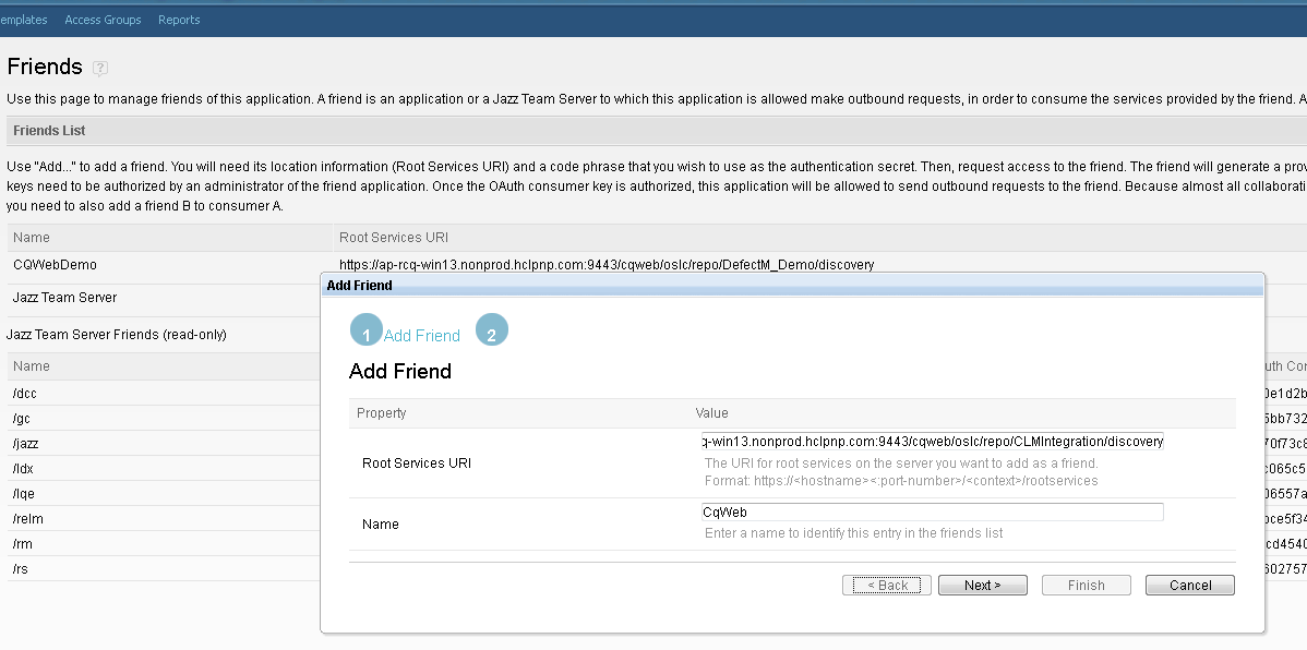 Note:The URL must be in pattern of: https://ap-rcqwin13.nonprod.hclpnp.com:9443/cqweb/oslc/repo/CLMIntegration/discovery or https://<hostname of CQ web>:9443/cqweb/oslc/repo/<Repository_name>/discovery. It must be https and not http.