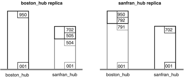 Operations with oplog IDs 1–950 have occurred at replica boston_hub.