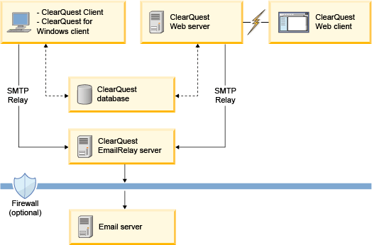 The Rational® ClearQuest® client and the Rational® ClearQuest® Web server communicate with the email server using SMTP Relay. The Rational® ClearQuest® Web client communicates to the Rational® ClearQuest® Web server through a browser. The Rational® ClearQuest® EmailRelay sever communicates through the optional firewall to the email server.