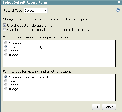 If you want to change the Forms default selection, click Forms and select Change default. The Select Default Record Form dialog appears. The settings show the default or your previous settings.