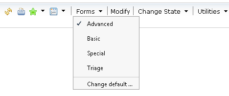 If the feature is enabled by administrator, when you view a record, you will see the Forms drop down list with the Advanced, Basic , Special and Triage options for the forms: