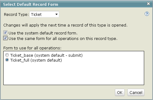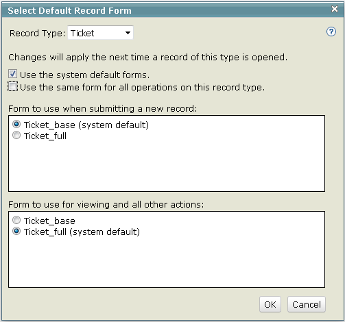 In the next example, the Ticket record type has two forms, one for submit named Ticket_base and one for all other operations named Ticket_full. When first opened, the Select Default Record Form dialog will show two lists. Each list shows the two forms, and identifies one as the system default.