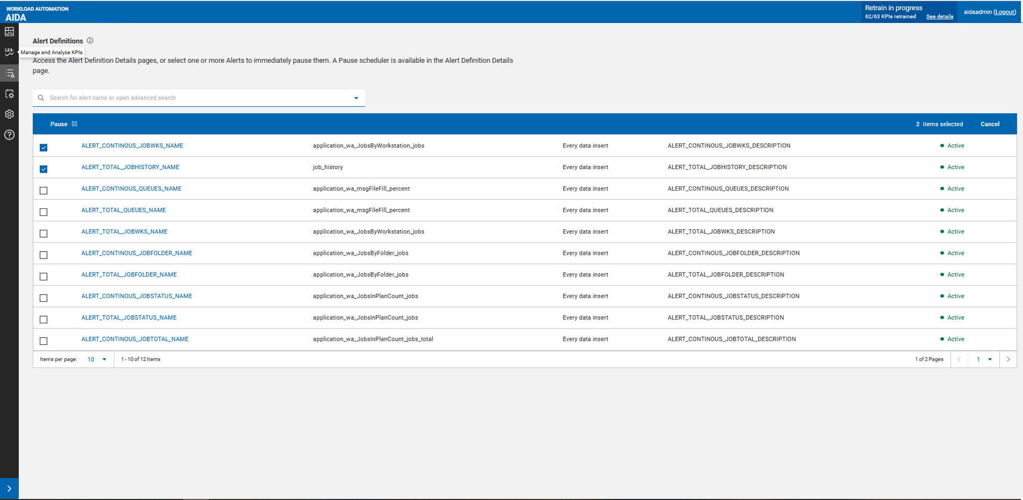 See all the alerts defined in AIDA. Pause one or more alerts immediately or on schedule.