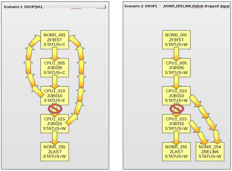 <predop>is specified inOPTIONS DROPand the identified operation is in status Complete, both sides of the dropped dependency become successors to<predop>. - If
