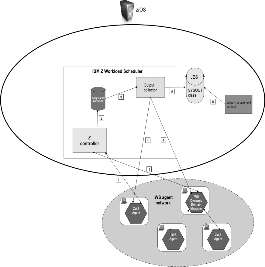 Every time a job or a dynamic job completes or terminates on an IBM Z Workload Scheduler Agent, the Output collector started task receives an event from the IBM Z Workload Scheduler controller (which manages all communication with the agents and the dynamic domain managers in the z-centric environment). The event contains the information necessary for Output collector to identify the job and where it run. The output collector then retrieves the job log from the agent, or the dynamic domain manager if the job is dynamic, and copies it to a SYSOUT in JES (using a specific SYSOUT class) to make it available to an output management product.