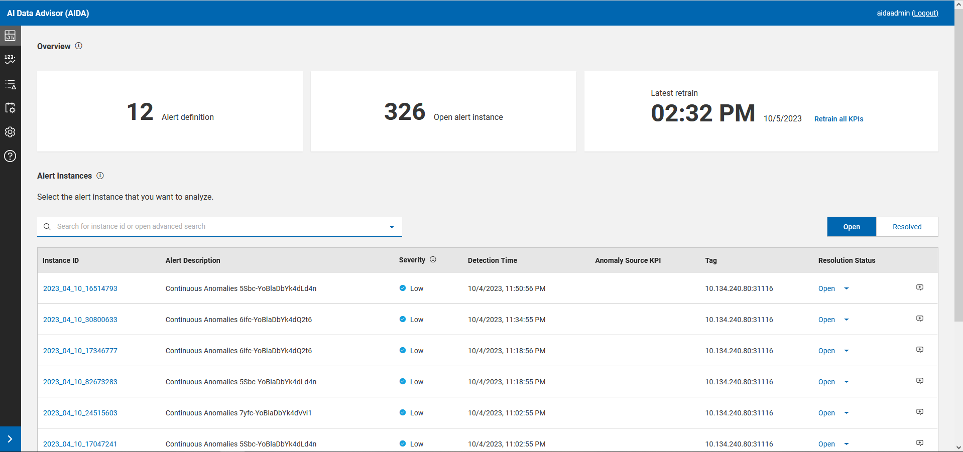 In the alert overview dashboard you can view the full list of alert instances and change their status to resolved.