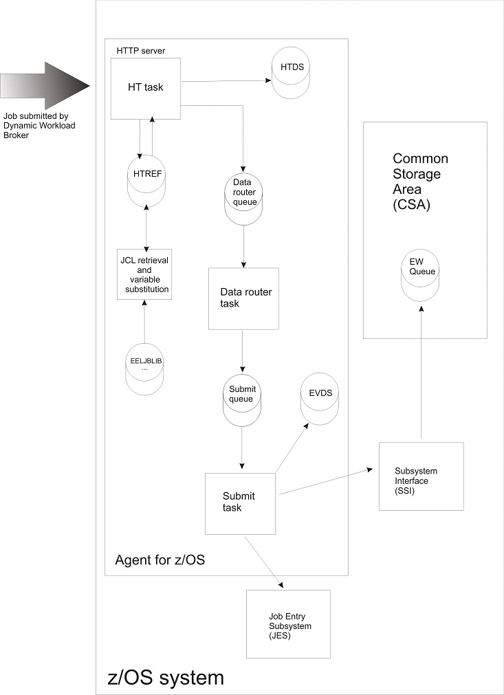 Note that the JCLs coming from IBM Workload Scheduler are stored on disk (HTDS). This guarantees that, if the agent is interrupted, the jobs are not lost, but sent to JES when the agent resumes.