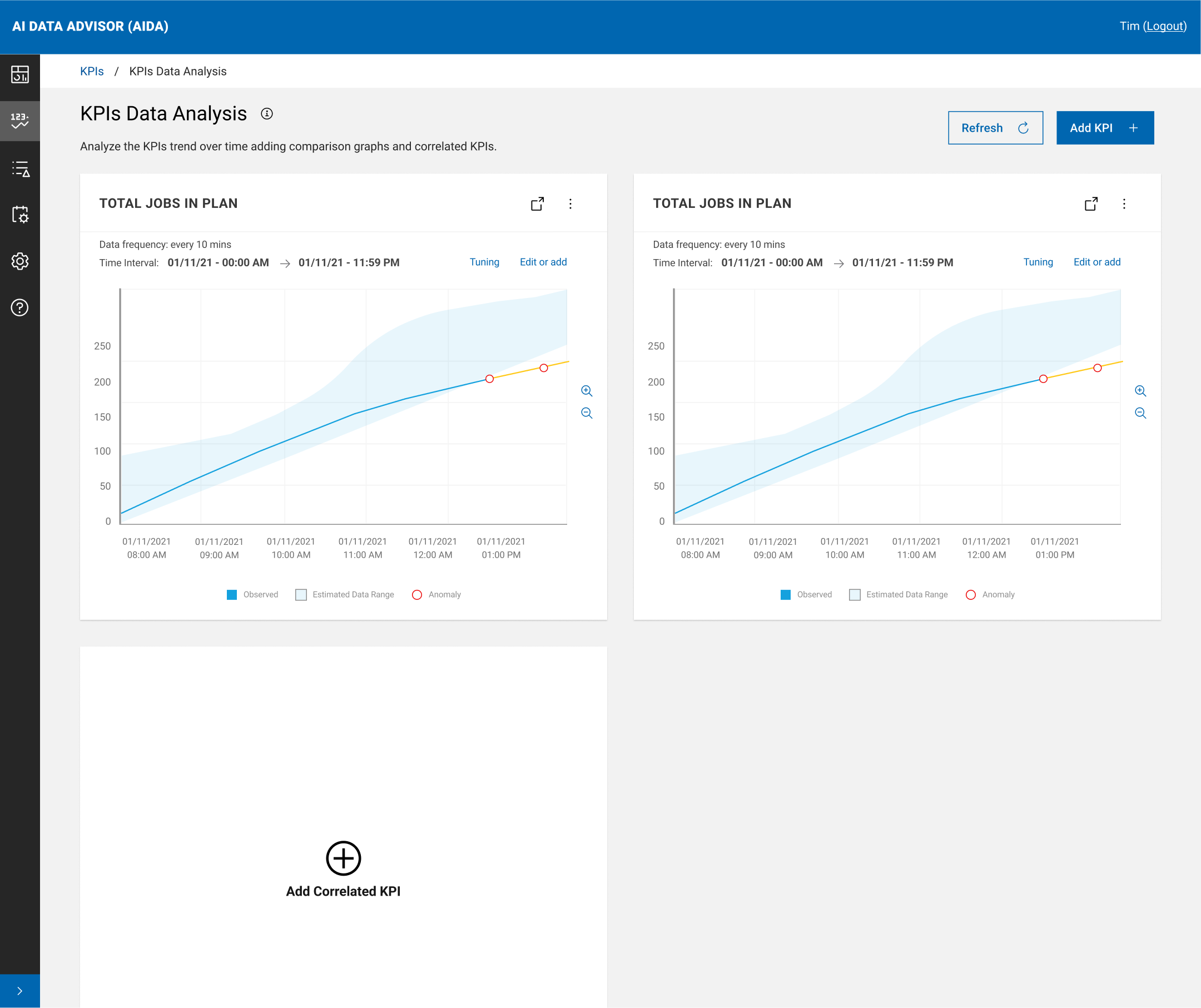 From AIDA left-hand sidebar, select KPIs to open the KPIs page. Select one or more KPIs and then select the Open action to open the KPIs Data Analysis page.