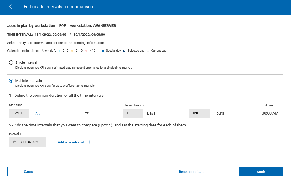 5. Select Reset to default to return to the original time interval, or Close to close the Datepicker panel.