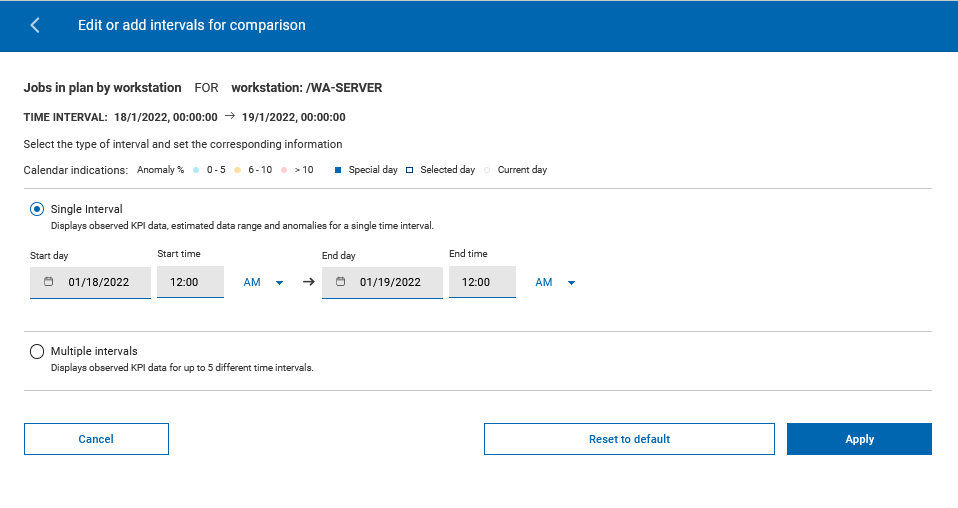 1. Modify the Start Date and End Date current values, or select the new start date and end date directly on the calendars. To set an interval within a single day, select the same day on both calendars.