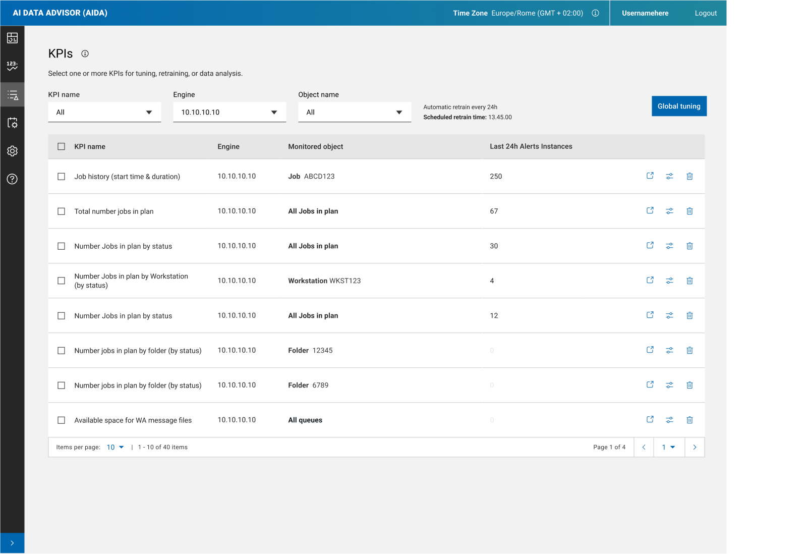 This page shows you the KPIs managed by AIDA.