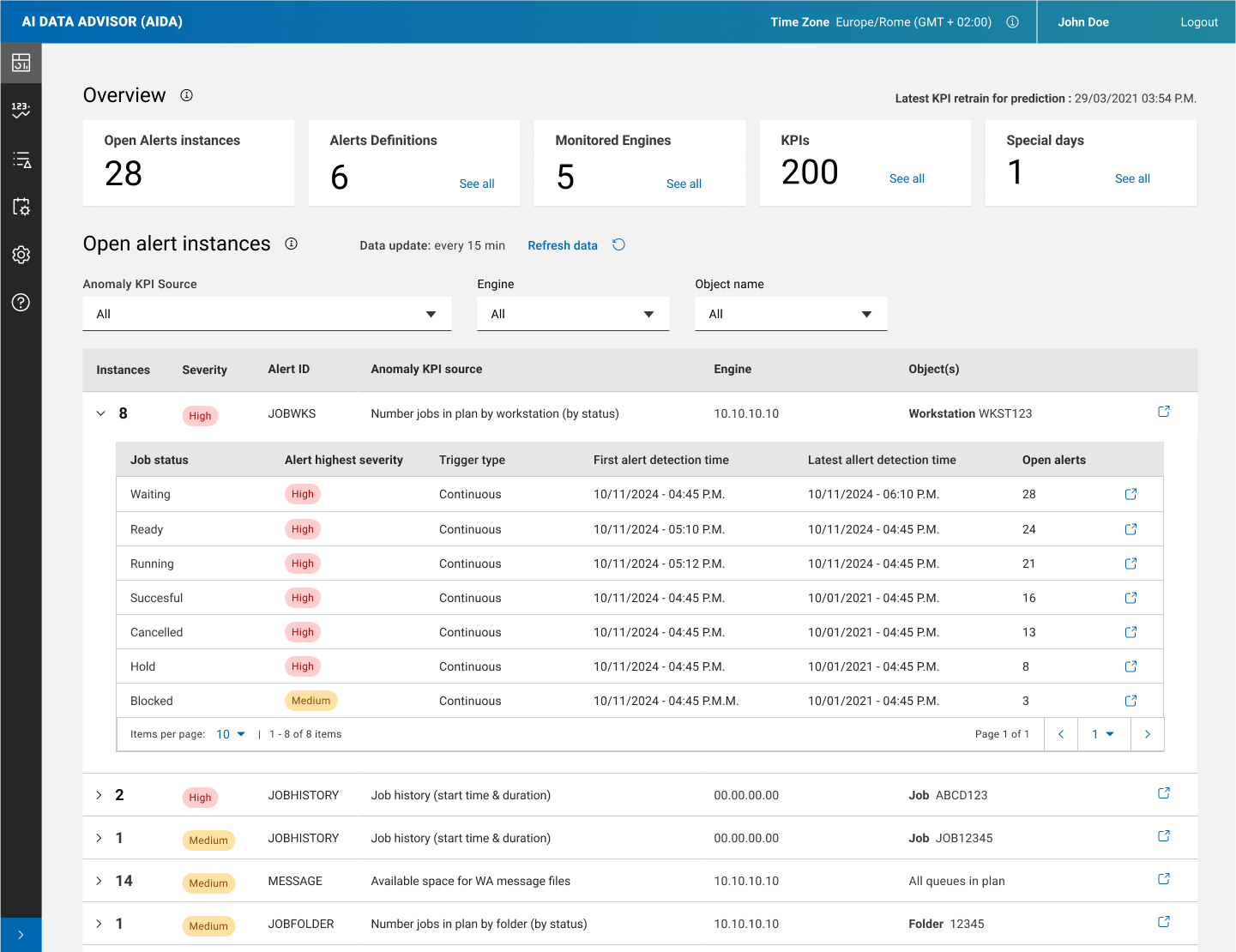 Note: Alert instances in Open status are automatically marked as Resolved after a time period defined by the RESOLVE_ALERTS_AFTER_DAYS parameter configured for AIDA Exporter component (default value = 1 day).