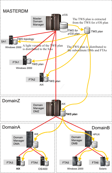 IBM Z Workload Scheduler creates the production plan also for the distributed network and sends it to the domain managers and to the directly-connected agents. The domain managers send a copy of the plan to each of their agents and subordinate domain managers for execution.