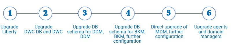 - Upgrading WebSphere Application Server Liberty on the workstations hosting Dynamic Workload Console and the server components (dynamic domain manager and its backups, master domain manager and its backups).