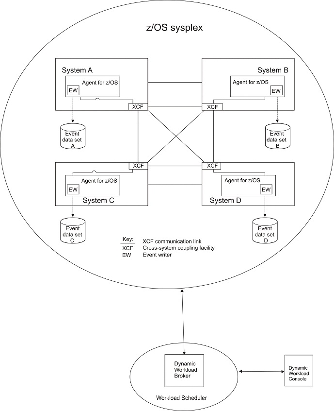The next figure gives a representation of four systems running in a sysplex environment, connected using cross-system coupling facility (XCF) communication links, and linked to a dynamic workload broker instance.