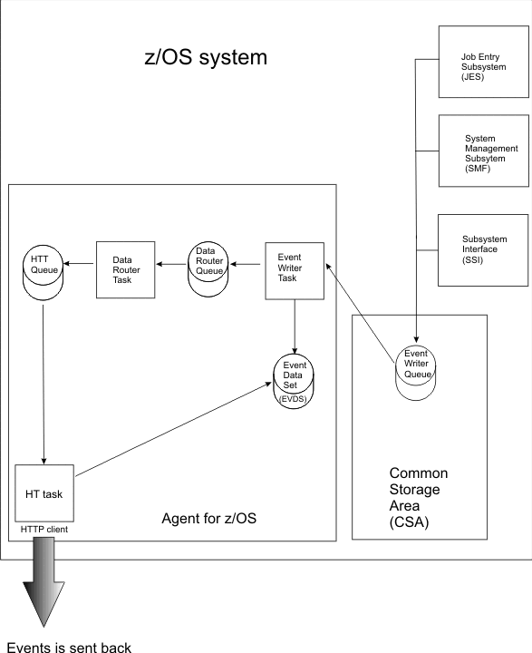 Note that the events are stored in the event writer queue in CSA and also in the event data set (EVDS) on disk. This guarantees that, if the agent is interrupted, they are not lost, but sent to IBM Workload Scheduler when the agent resumes.