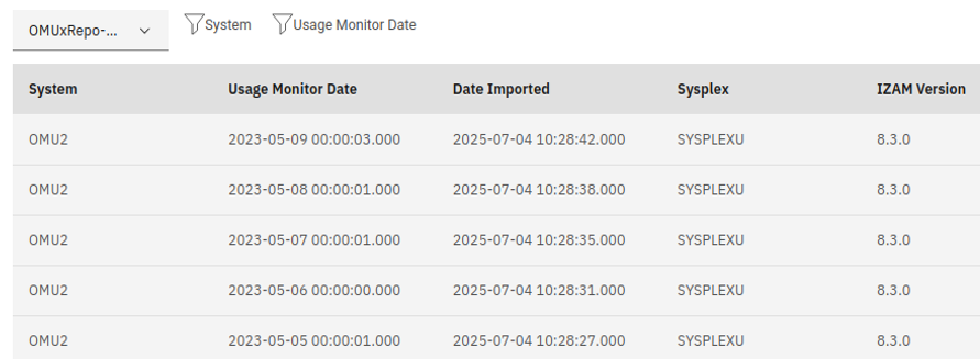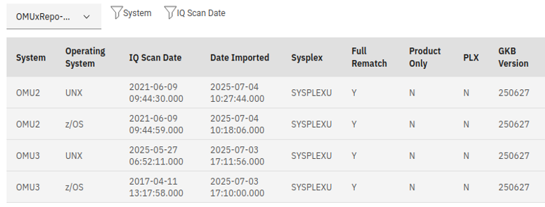 The IQ (Inquisitor) and UM (Usage Monitor) history reports show details on the imported data files used to load the selected repository data. Scan and import dates, along with other system-related, GKB version/date, and IQ or UM collector parameters/filters are displayed.