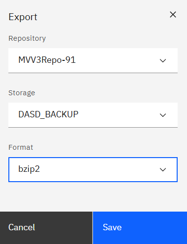 menu.Note:By default DASD_BACKUP docker volume is available for use though for export processing it is recommended to have configured external storage media locations (Storage1 and/or Storage2) and to select one of those. Any external backup storage media that is not configured or available will not be enabled.