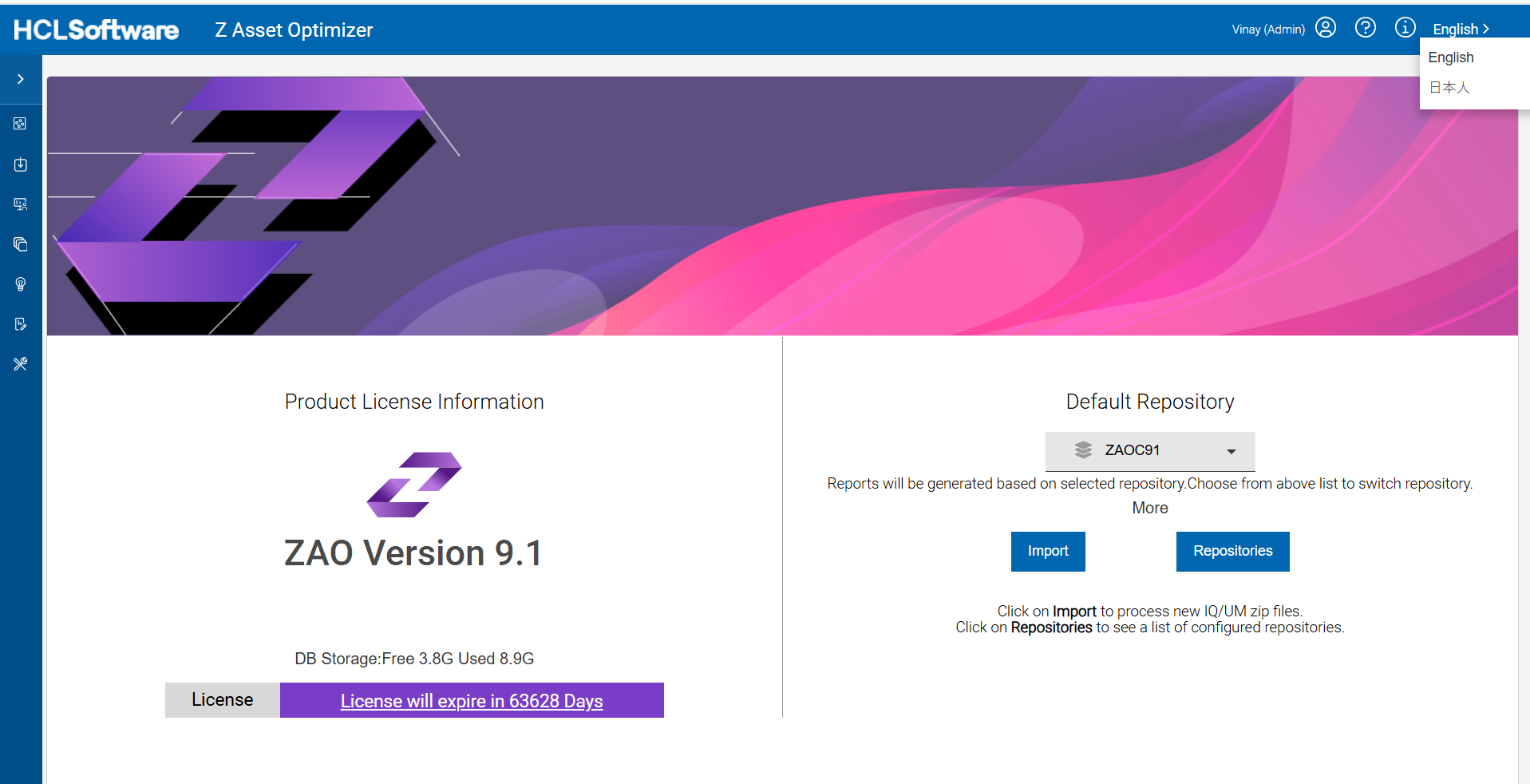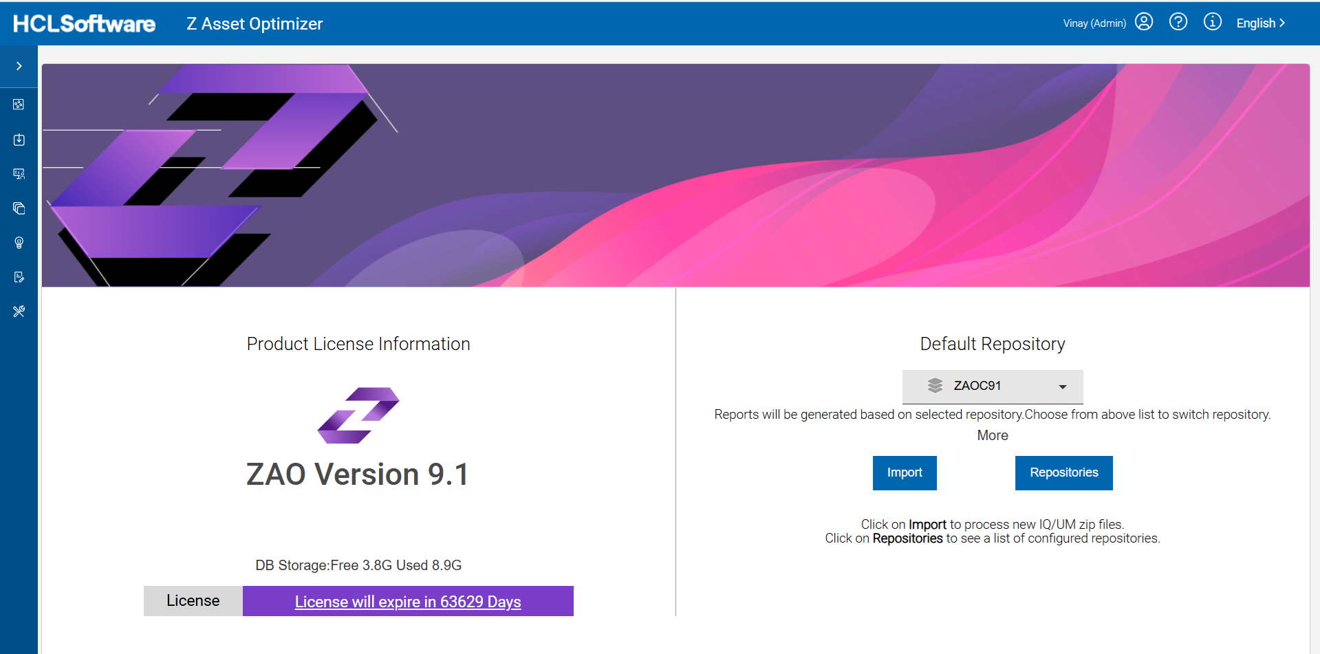 - The selected available sub-menus items will then be displayed allowing for import processing, administration reports, asset report viewing, discovery report viewing and repository utilities.